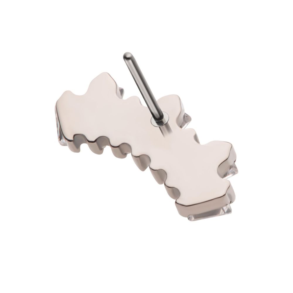 Titanium Threadless Prong Set Baguette CZ 7-Cluster Fan Shape Top. These Threadless Tops are made from Implant Grade Titanium TI-6AL-4V ELI ASTM F136 with 25g durable Titanium Pin designed to be practical and easy to use. Fitting all sizes of pins and bases in our threadless body jewelry line. Pin Size: 0.45mm x 4.7mm.