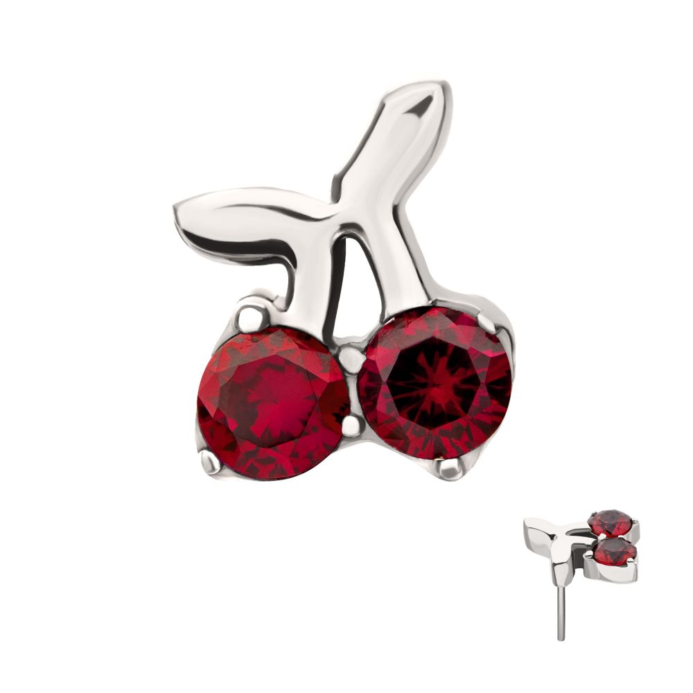 Titanium Threadless Prong Set Gem Cherry Top. This Threadless Top is made from Implant Grade Titanium TI-6AL-4V ELI ASTM F136 with 25g durable Titanium Pin designed to be practical and easy to use. Fitting all sizes of pins and bases in our threadless body jewelry line. Pin Size: 0.45mm x 4.7mm.