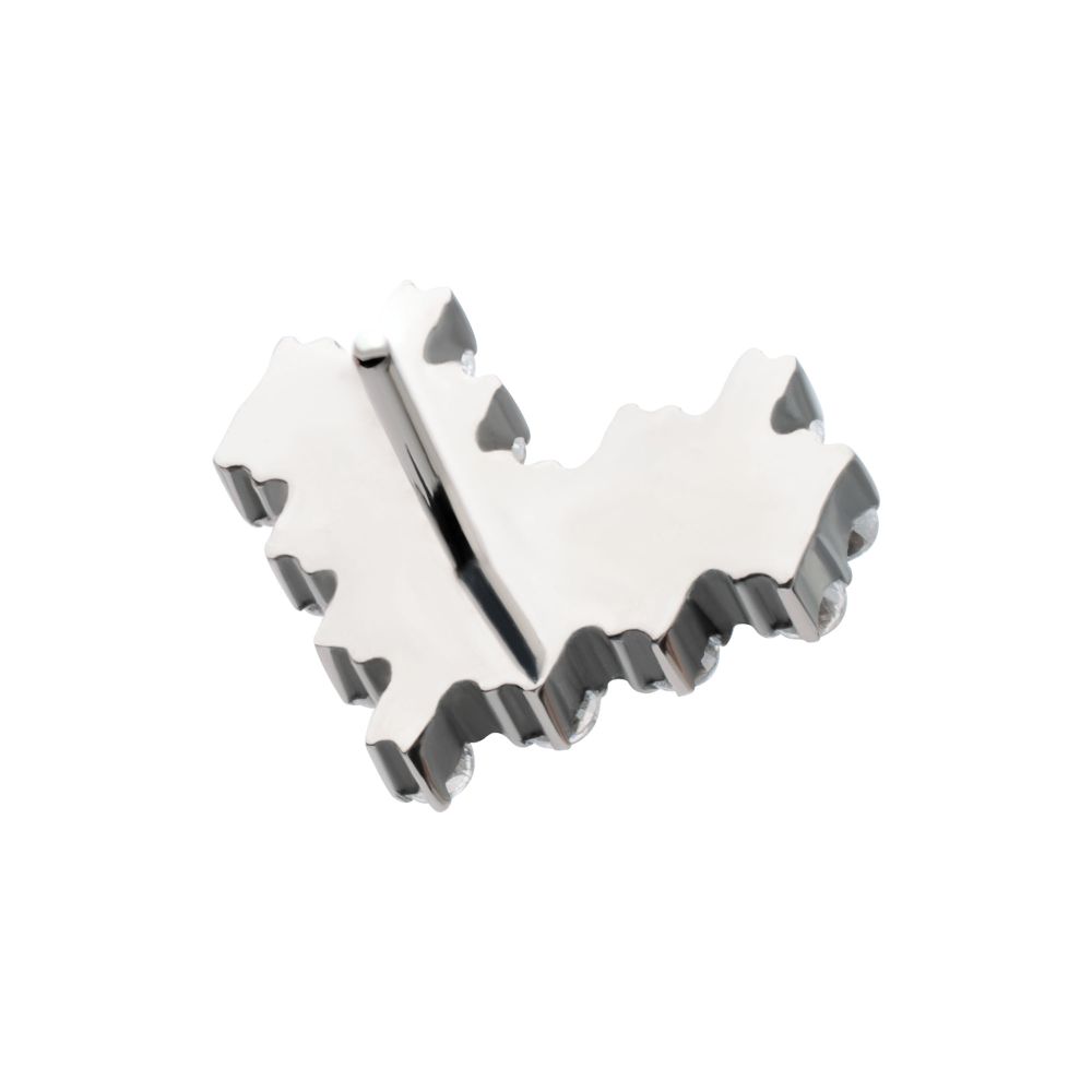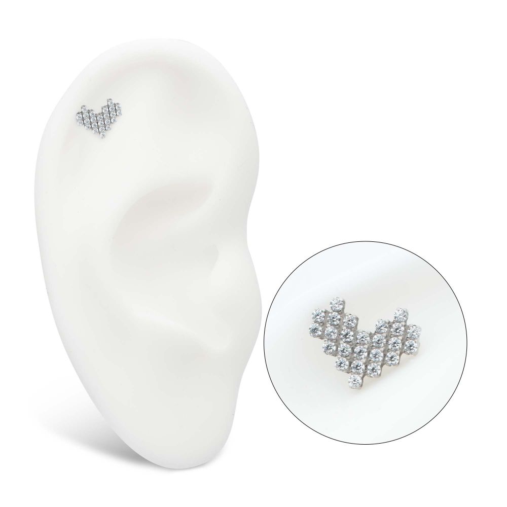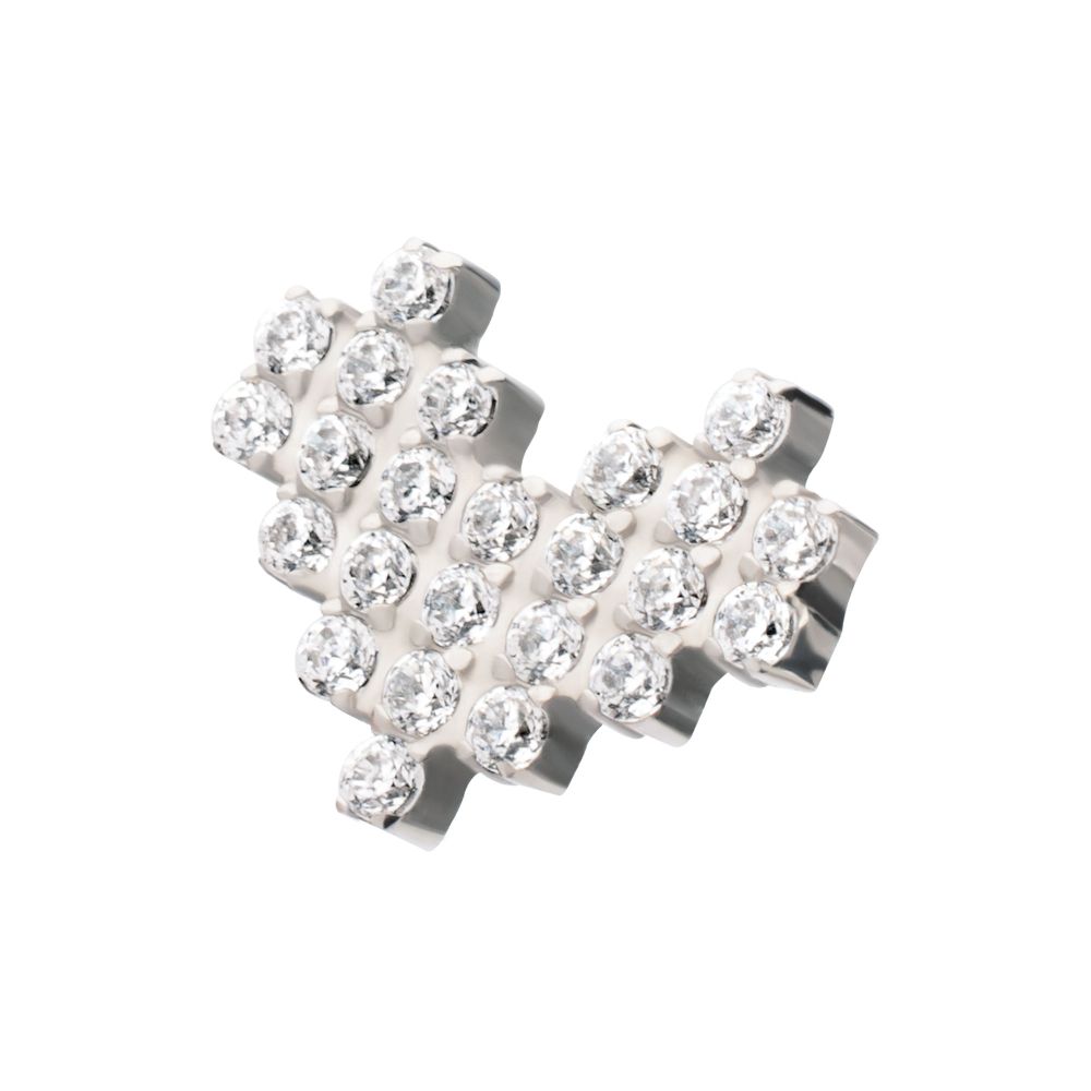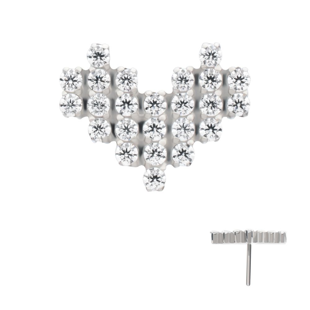 Titanium Threadless Prong Set Round CZ Cluster Heart Top. This Threadless Top is made from Implant Grade Titanium TI-6AL-4V ELI ASTM F136 with 25g durable Titanium Pin designed to be practical and easy to use. Fitting all sizes of pins and bases in our threadless body jewelry line. Pin Size: 0.45mm x 4.7mm.