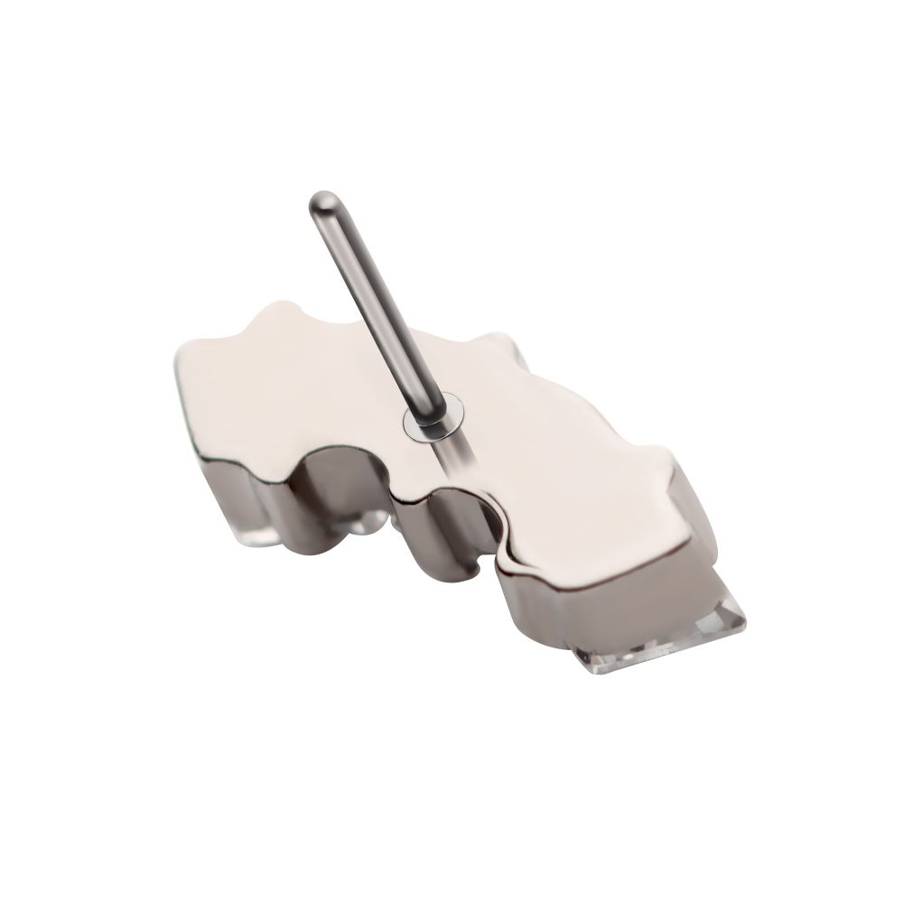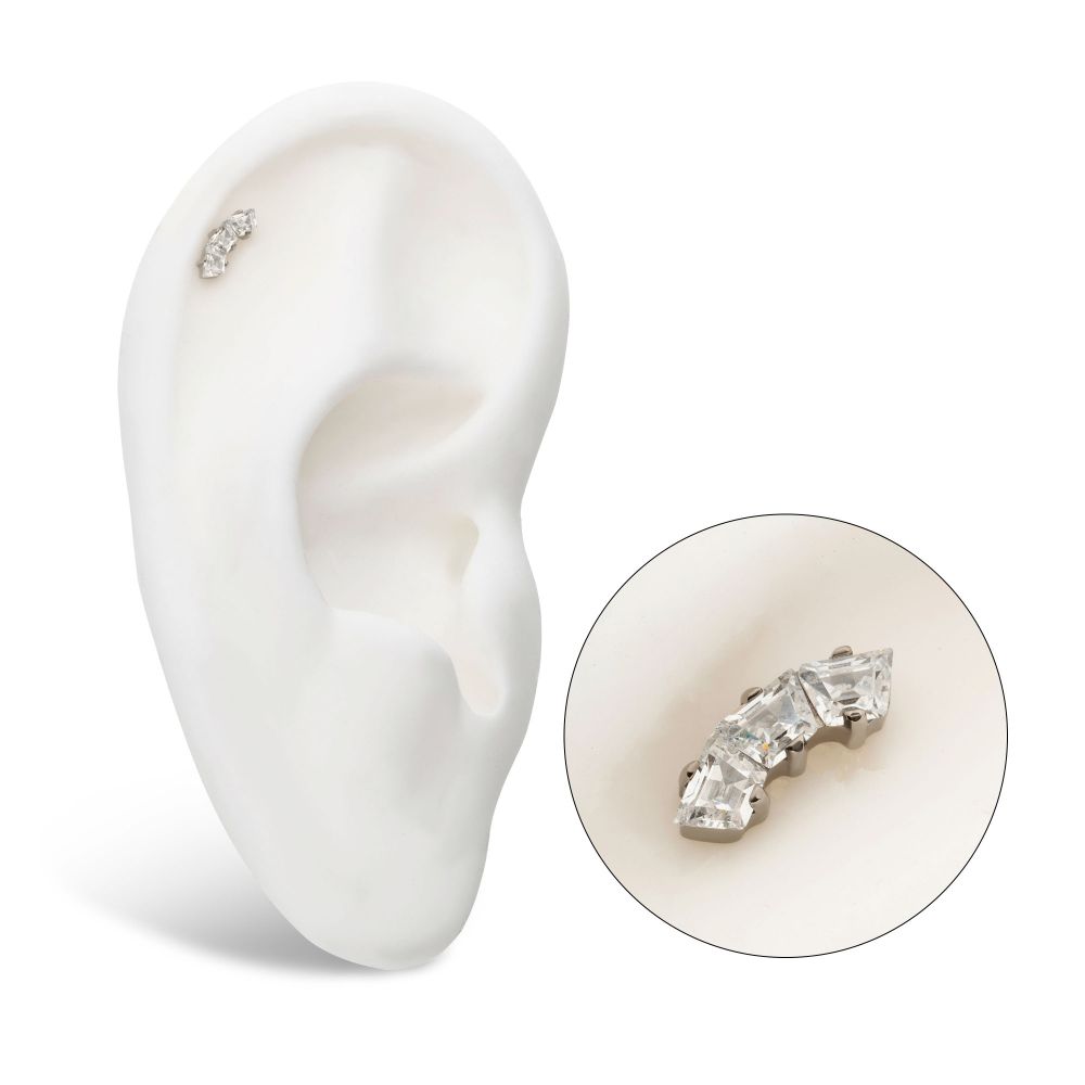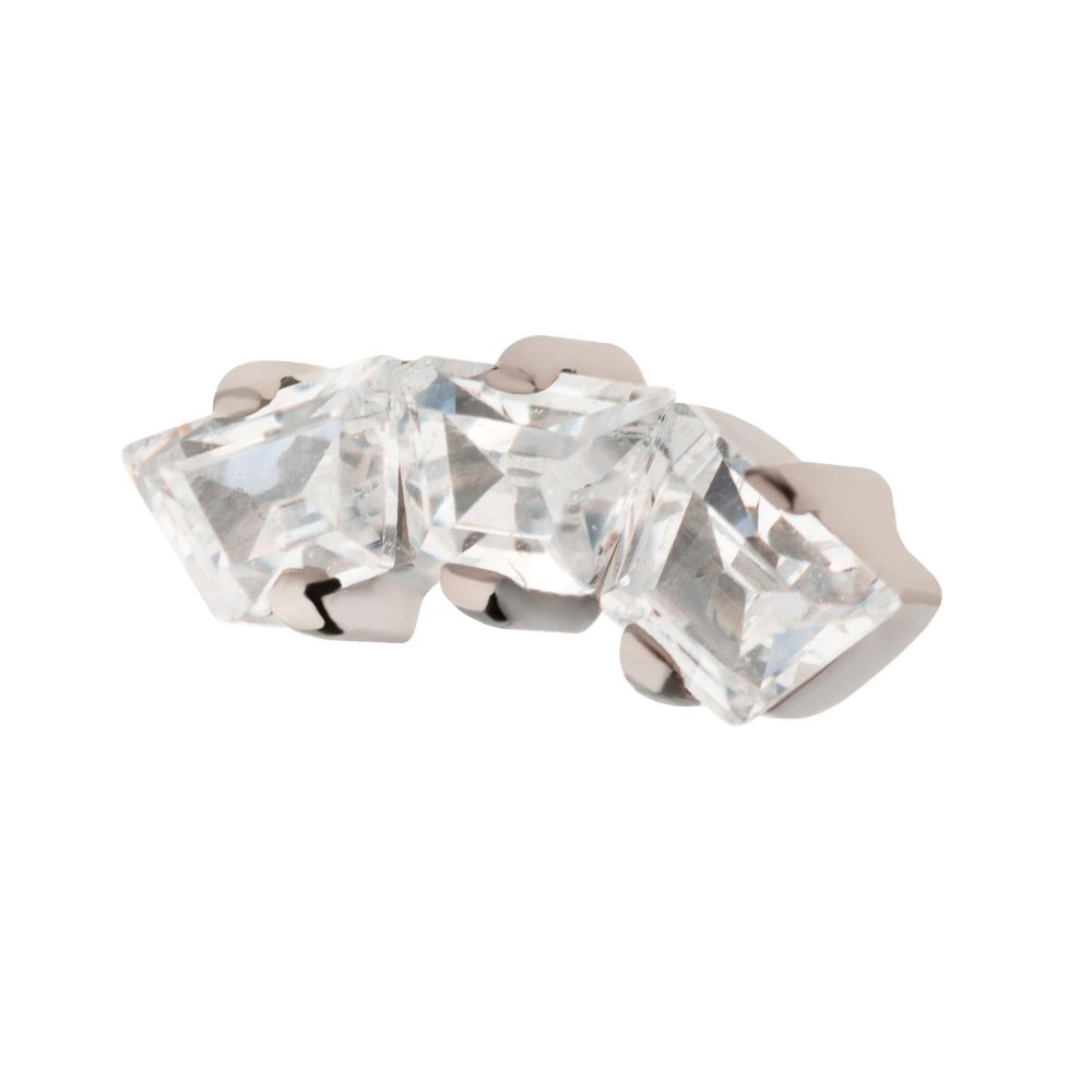 Titanium Threadless Prong Set Trapezoid CZ 3-Cluster Top. This Threadless Top is made from Implant Grade Titanium TI-6AL-4V ELI ASTM F136 with 25g durable Titanium Pin designed to be practical and easy to use. Fitting all sizes of pins and bases in our threadless body jewelry line. Pin Size: 0.45mm x 4.7mm.