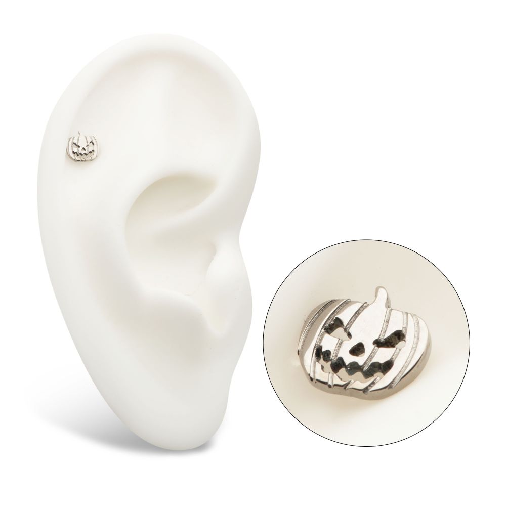 Titanium Threadless Pumpkin Top. This Threadless Top is made from Implant Grade Titanium TI-6AL-4V ELI ASTM F136 with 25g durable Titanium Pin designed to be practical and easy to use. Fitting all sizes of pins and bases in our threadless body jewelry line. Pin Size: 0.45mm x 4.7mm.