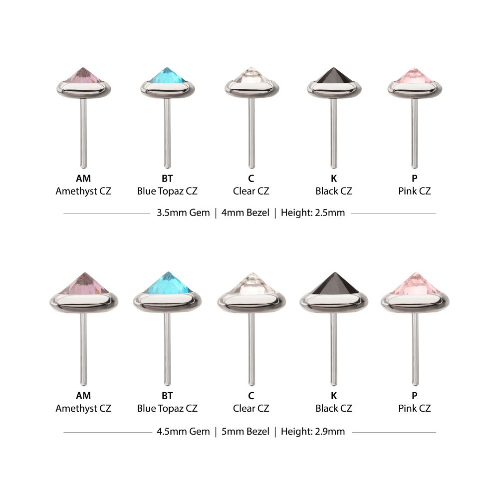 Titanium Threadless Round Bezel Set Inverse Gem Top. Manufactured from High Polish Implant Grade Titanium (Ti-6AL-4V-ELI ASTM F136). Pin Size: 0.45mm x 4.7mm.