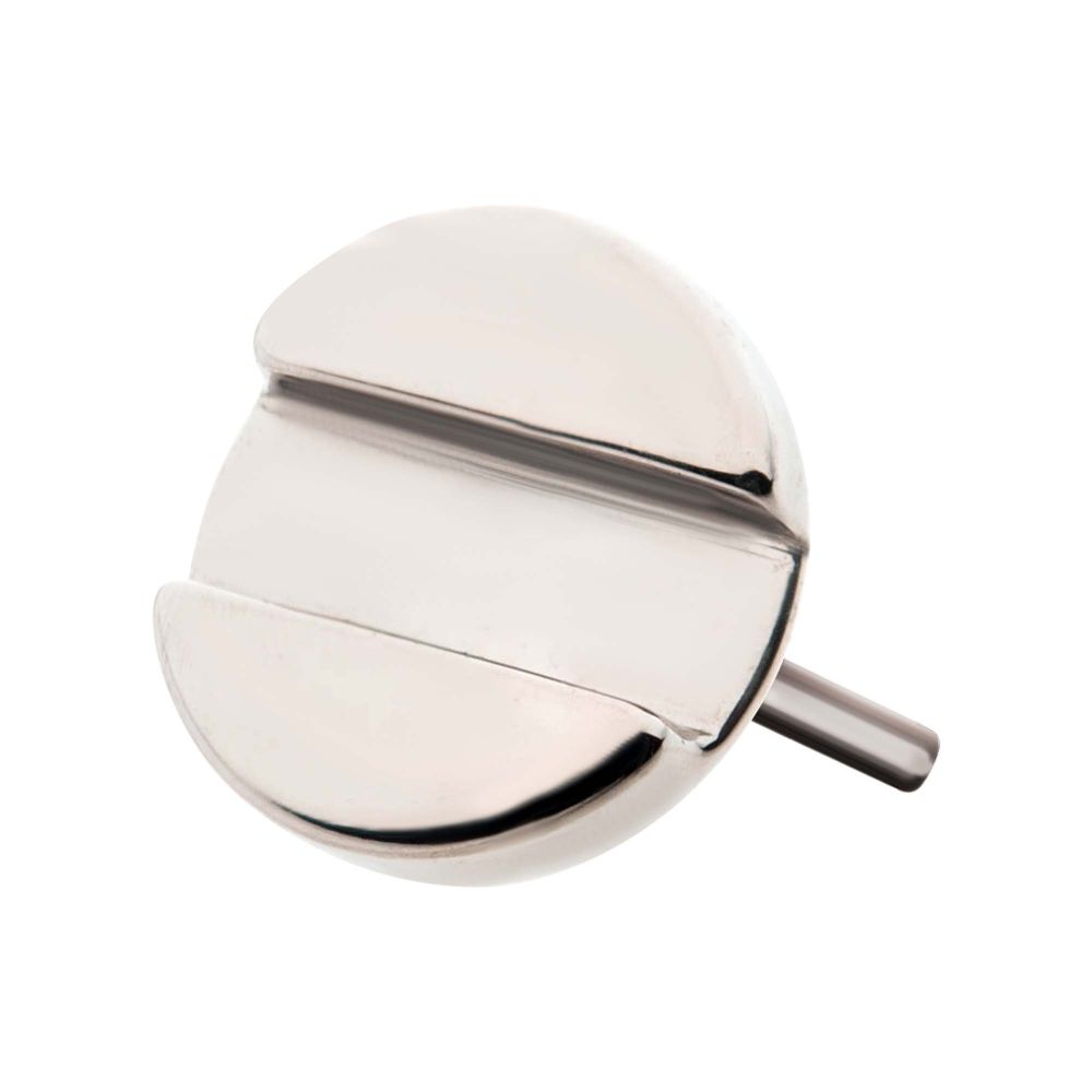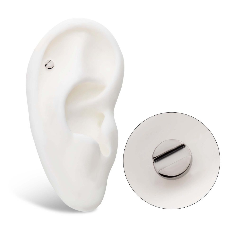 Titanium Threadless Slotted Screw Top. This Threadless Top is made from Implant Grade Titanium TI-6AL-4V ELI ASTM F136 with 25g durable Titanium Pin designed to be practical and easy to use. Fitting all sizes of pins and bases in our threadless body jewelry line. Pin Size: 0.45mm x 4.7mm.