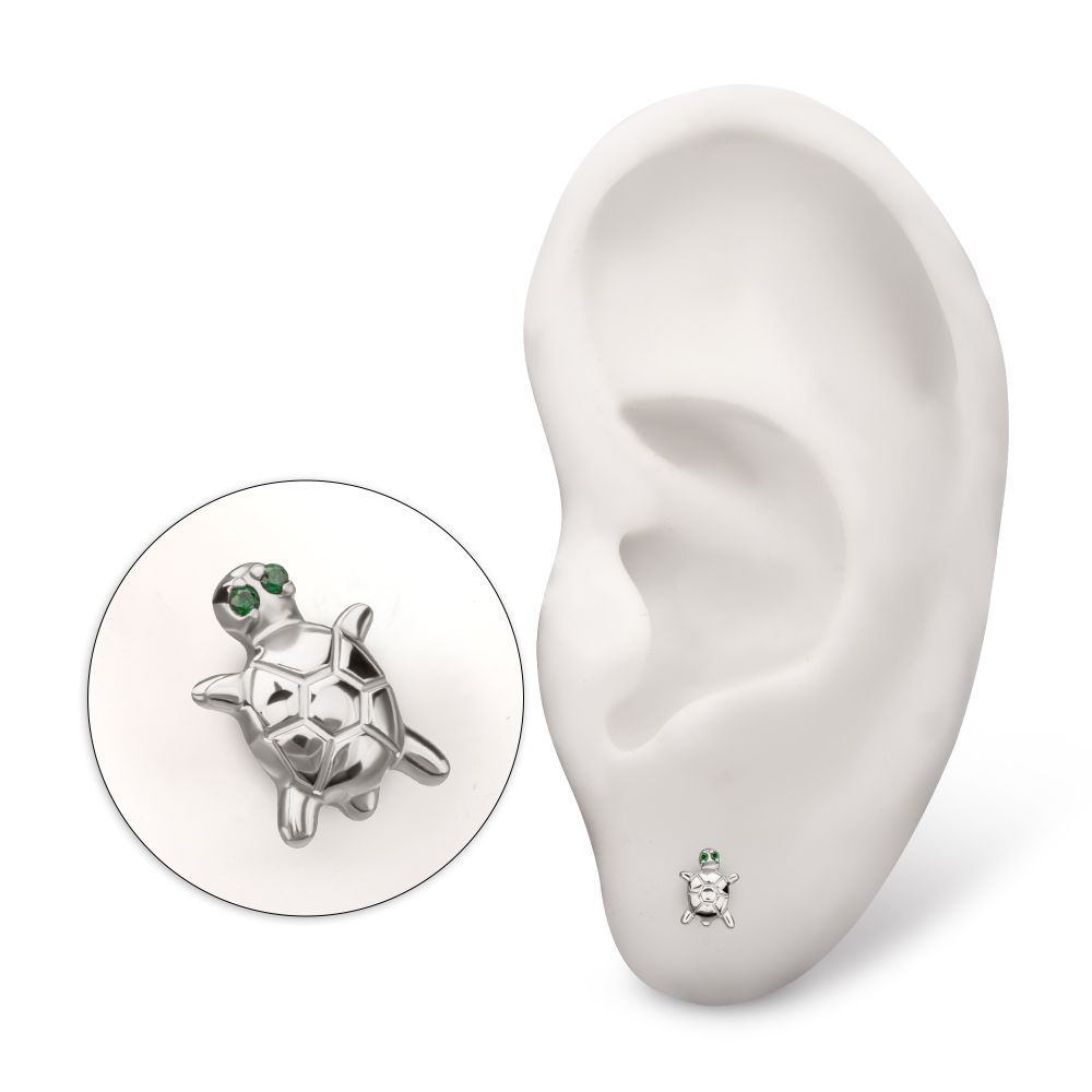 Titanium Threadless Turtle Top with Prong Set CZ Gem Eyes. Manufactured from High Polish Implant Grade Titanium (Ti-6AL-4V-ELI ASTM F136). Pin Size: 0.45mm x 4.7mm.