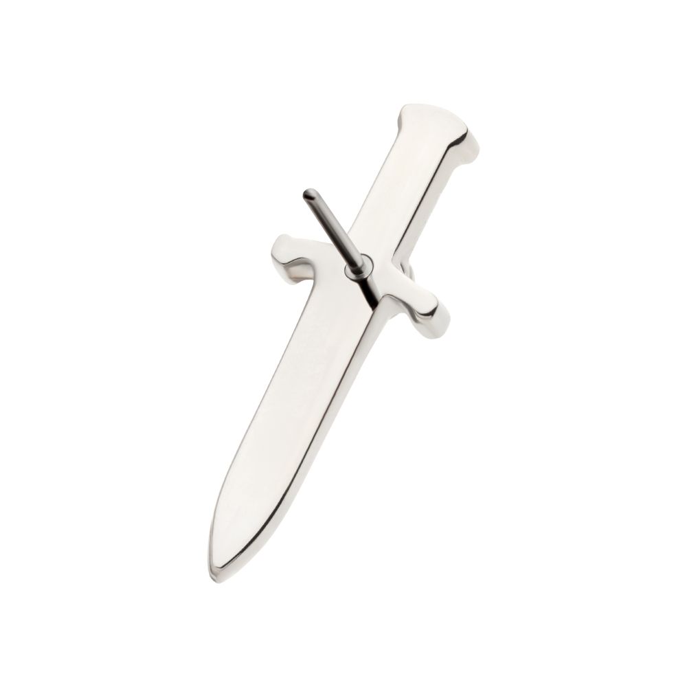Titanium Threadless with Bezel Set 1mm CZ Dagger Top. These Threadless Tops are made from Implant Grade Titanium TI-6AL-4V ELI ASTM F136 with 25g durable Titanium Pin designed to be practical and easy to use. Fitting all sizes of pins and bases in our threadless body jewelry line. Pin Size: 0.45mm x 4.7mm.