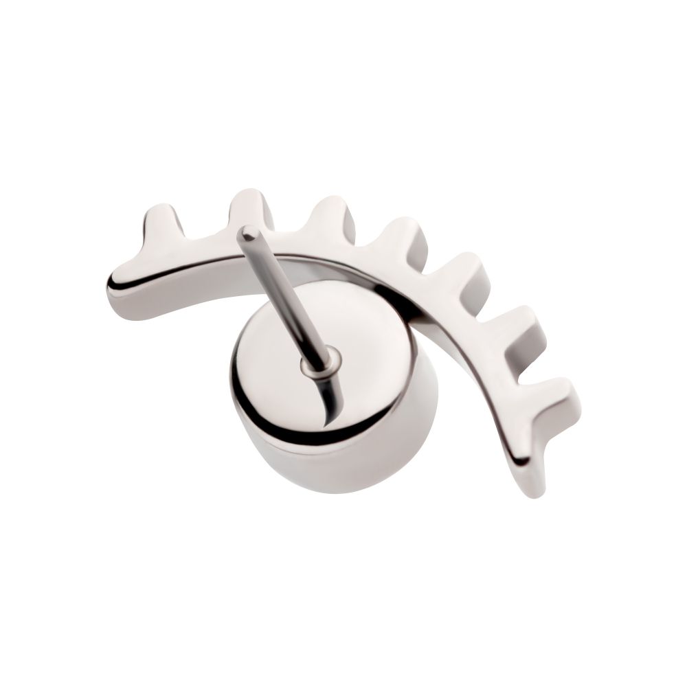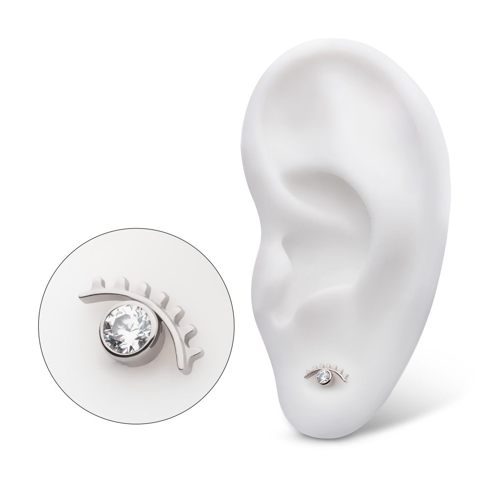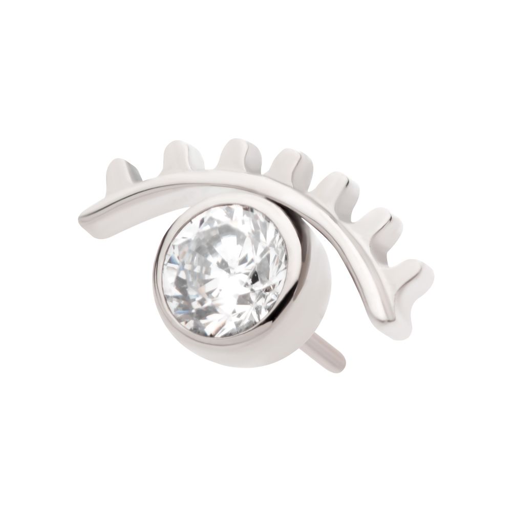 Titanium Threadless with Bezel Set CZ Cut Out Evil Eye Top. This Threadless Top is made from Implant Grade Titanium TI-6AL-4V ELI ASTM F136 with 25g durable Titanium Pin designed to be practical and easy to use. Fitting all sizes of pins and bases in our threadless body jewelry line. Pin Size: 0.45mm x 4.7mm.