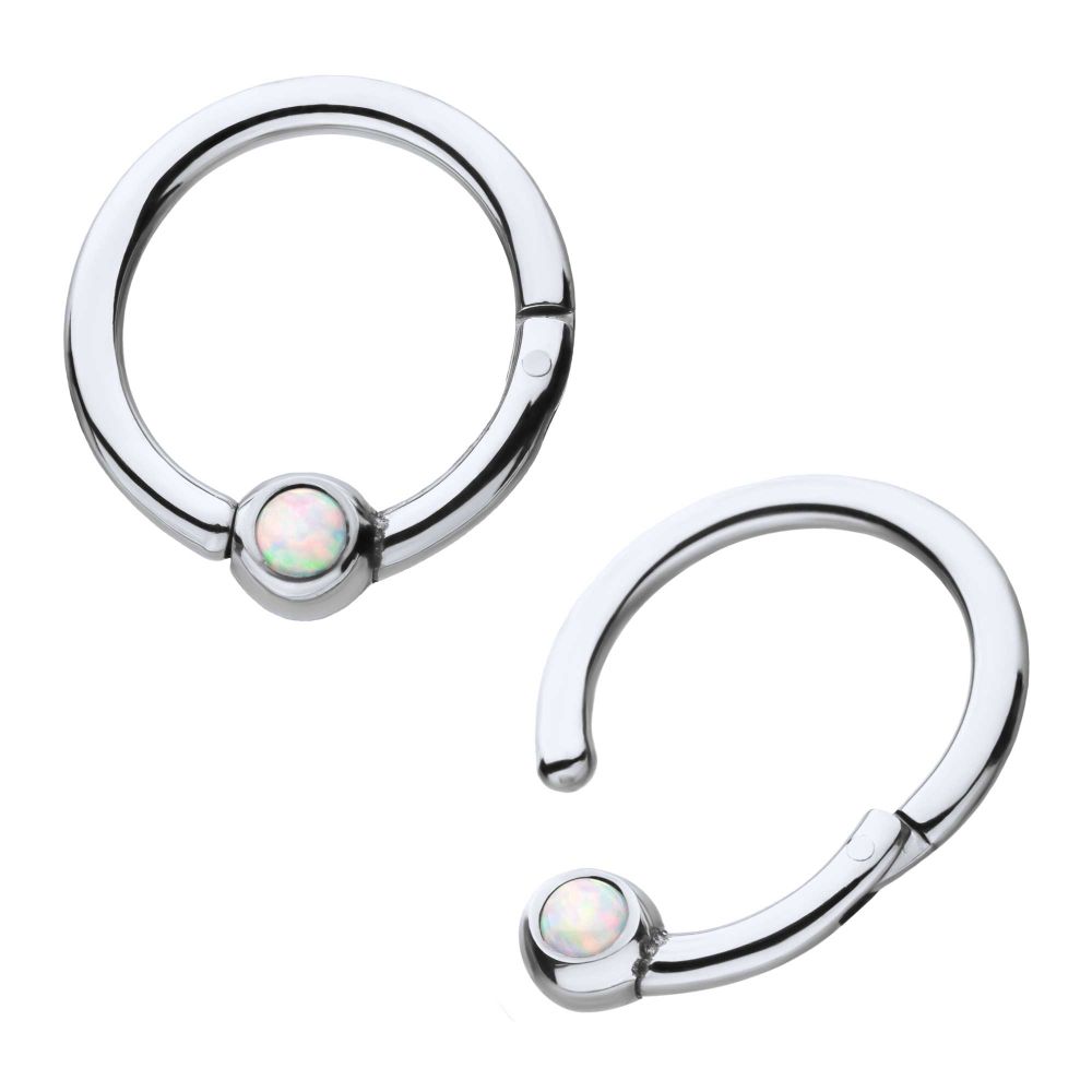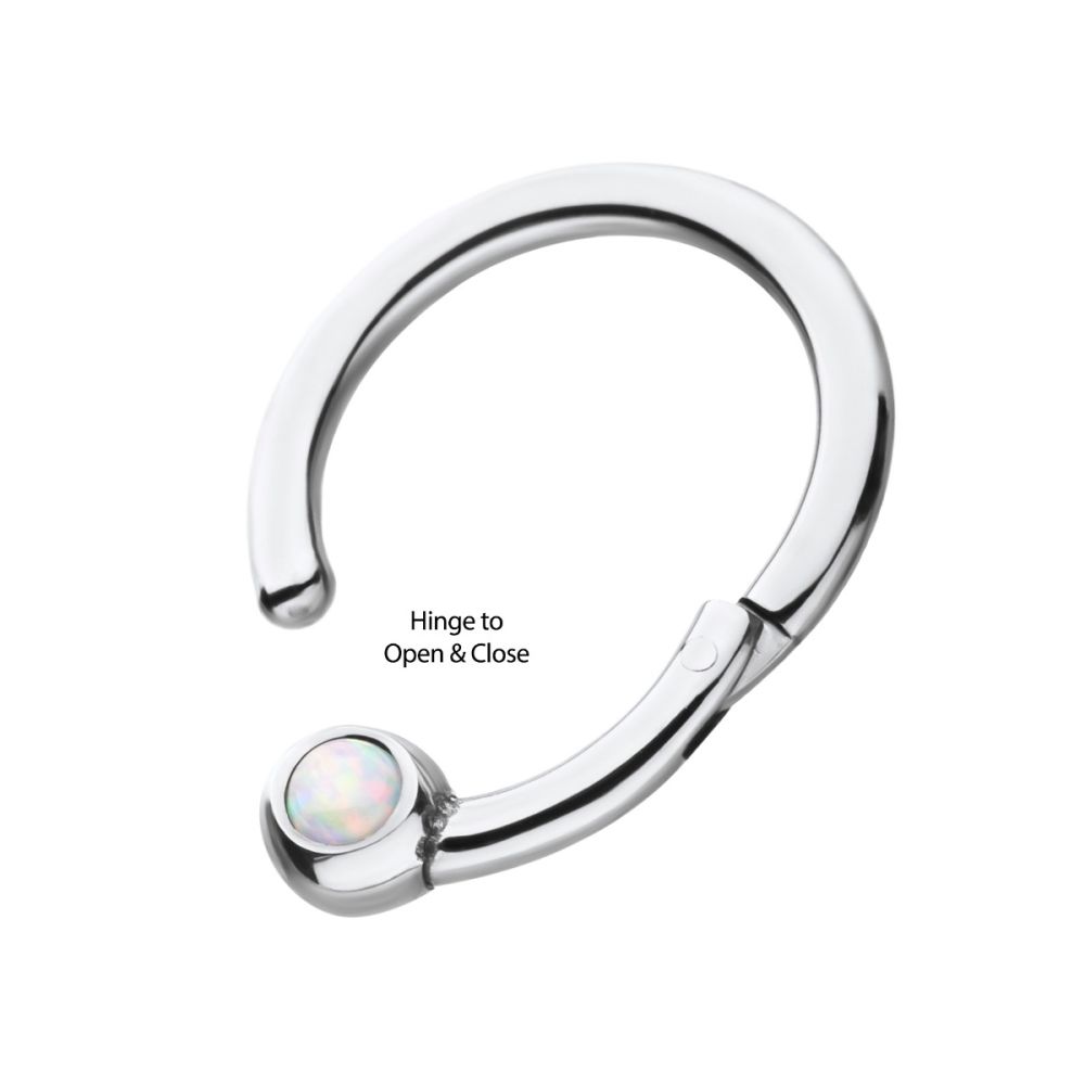 This titanium hinged segment ring opens and closes with ease and has a synthetic opal for a unique touch. Easier to open and close than a captive bead ring, but with the look of it, hinged segment rings are perfect for changing out jewelry with ease.