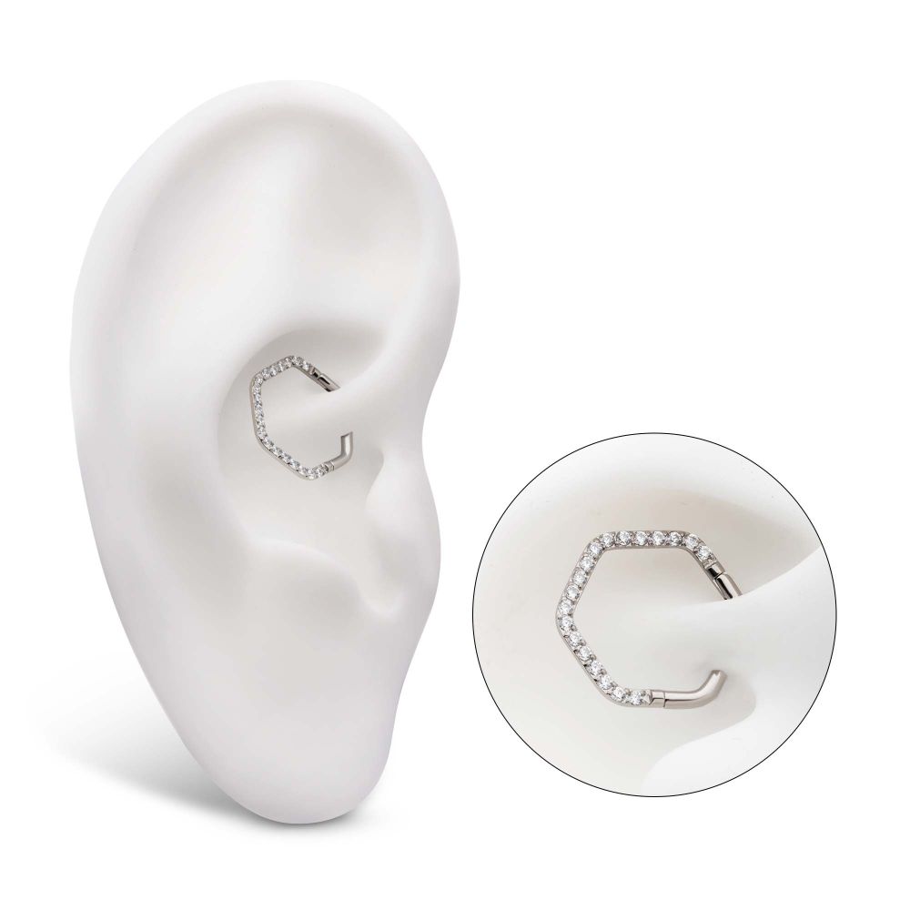 Titanium with 1mm CNC Set Clear CZ Eternity Hexagon Shape Front Facing Hinged Segment Clicker. Manufactured from High Polish Implant Grade Titanium (Ti-6AL-4V-ELI ASTM F136).